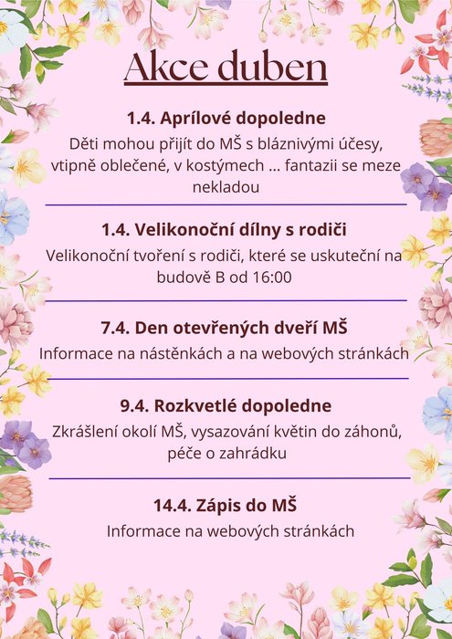 Vprvní polovině dubna se v naší mateřské škole bude konat opět řada akcí.